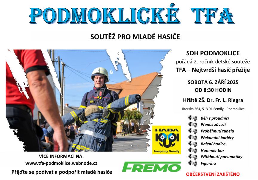 TFA je nejtvrdší hasičskou disciplínou, která se těší čím dál tím větší oblibě napříč všemi věkovými kategoriemi, takže na své si přijdou i děti a mládež. V roce 2024 se Náš sbor rozhodl uspořádat 1. ročník dětské soutěže TFA. Děti jsou rozděleny podle věku do kategorií, a tomu je přizpůsobena náročnost celé tratě. Na závodníky čeká celá řada náročných silových úkolů.